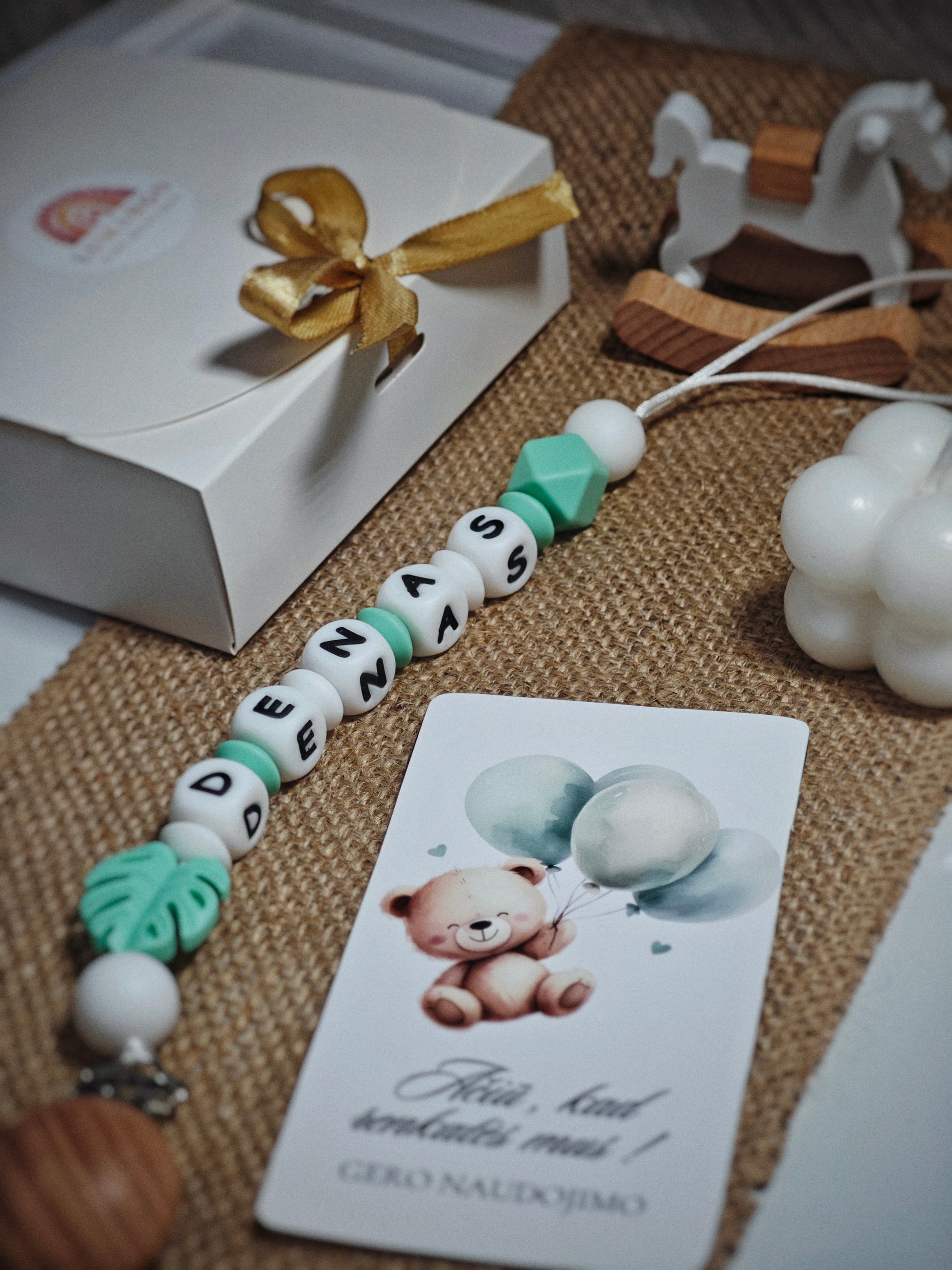 Rankų darbo personalizuotas vardinis čiulptuko laikiklis