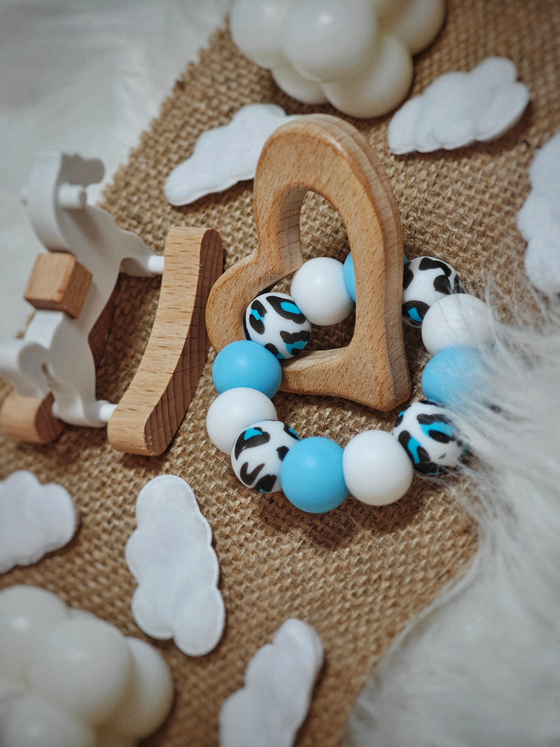 Šis rankų darbo kramtukas pagamintas iš natūralios buko medienos ir minkštų maistinio silikono karoliukų. Skirtingos tekstūros ramina jautrias dantenas, lavina smulkiąją motoriką ir suteikia smagų užsiėmimą mažoms rankytėms.