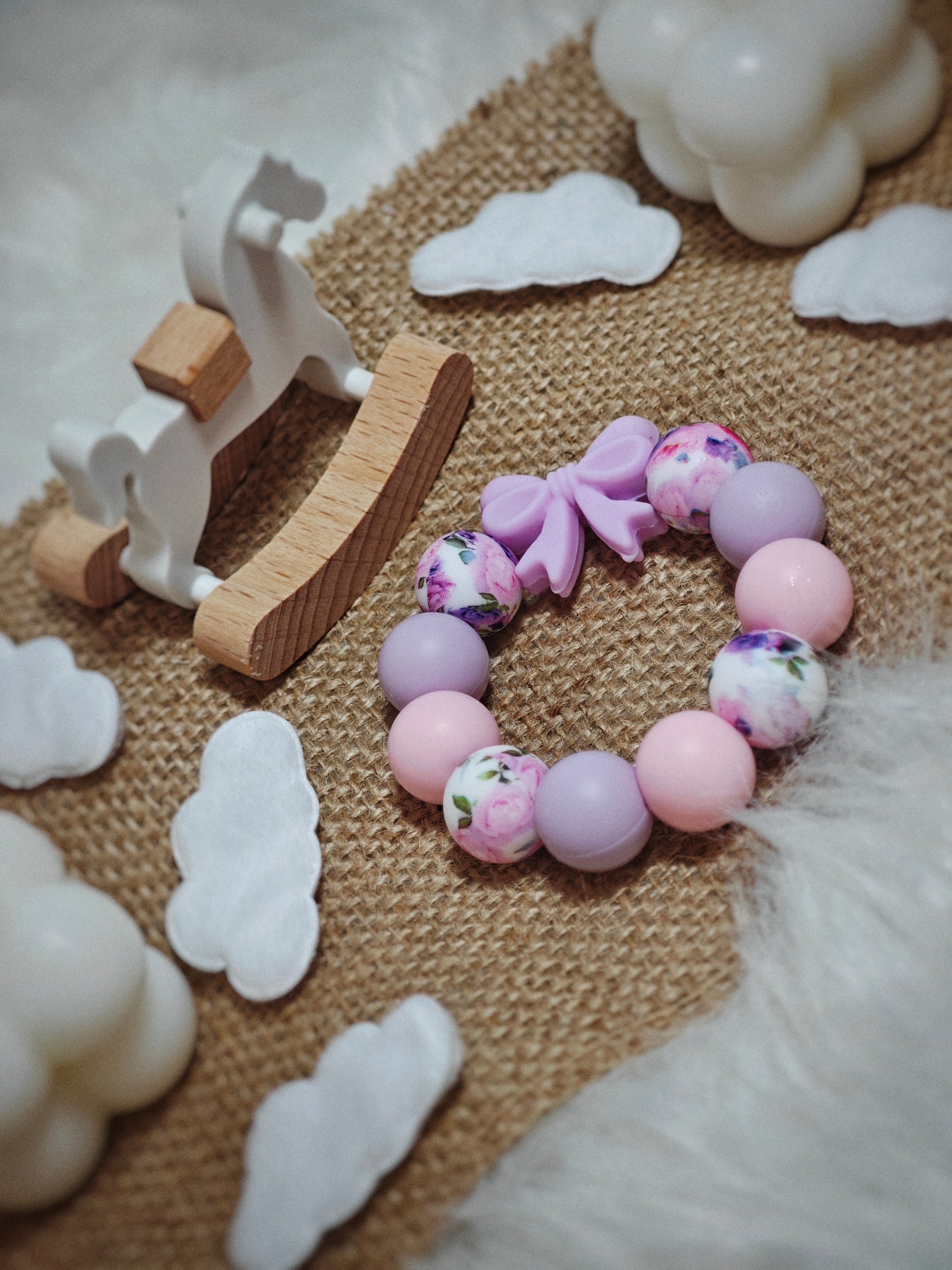 Linksmas ir stilingas kramtukas - apyrankė su gėlių rašto karoliukais, derinama su švelnia rožine bei violetine spalva. Mielas kaspinėlis suteikia žaismingumo. Puikus aksesuaras fotosesijoms ir kasdieniam naudojimui. Patogus mažoms rankytėms, lavina motoriką ir padeda mažinti dantenų jautrumą.