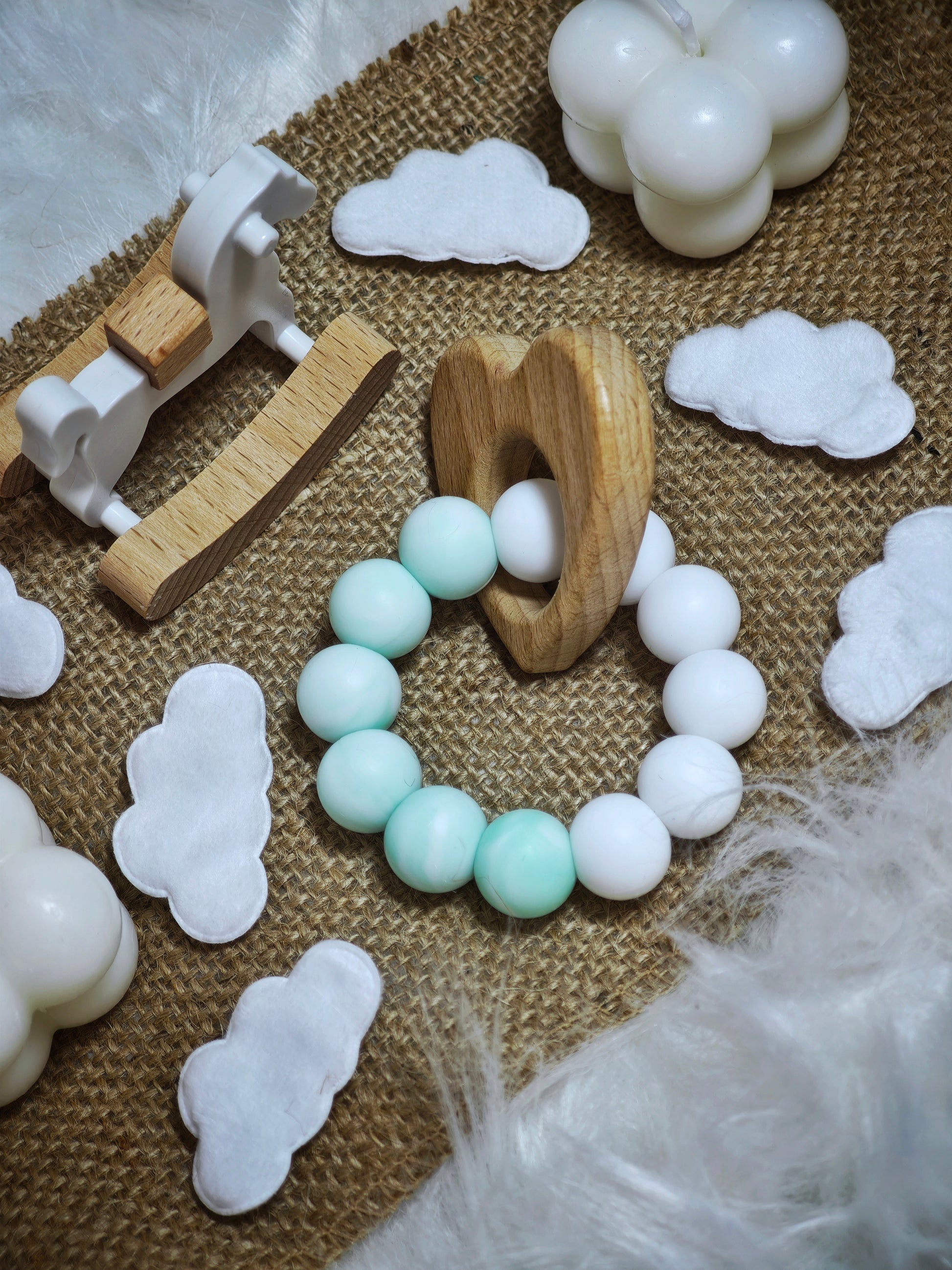 Natūralaus medžio širdelės formos kramtukas su minkštais silikoniniais karoliukais. Švelni mėtų ir balta spalvų derinys ramina kūdikį, skatina jutiminę raidą ir padeda mažinti dantenų niežulį dygstant dantukams. Saugi, rankų darbo dovana mažyliui