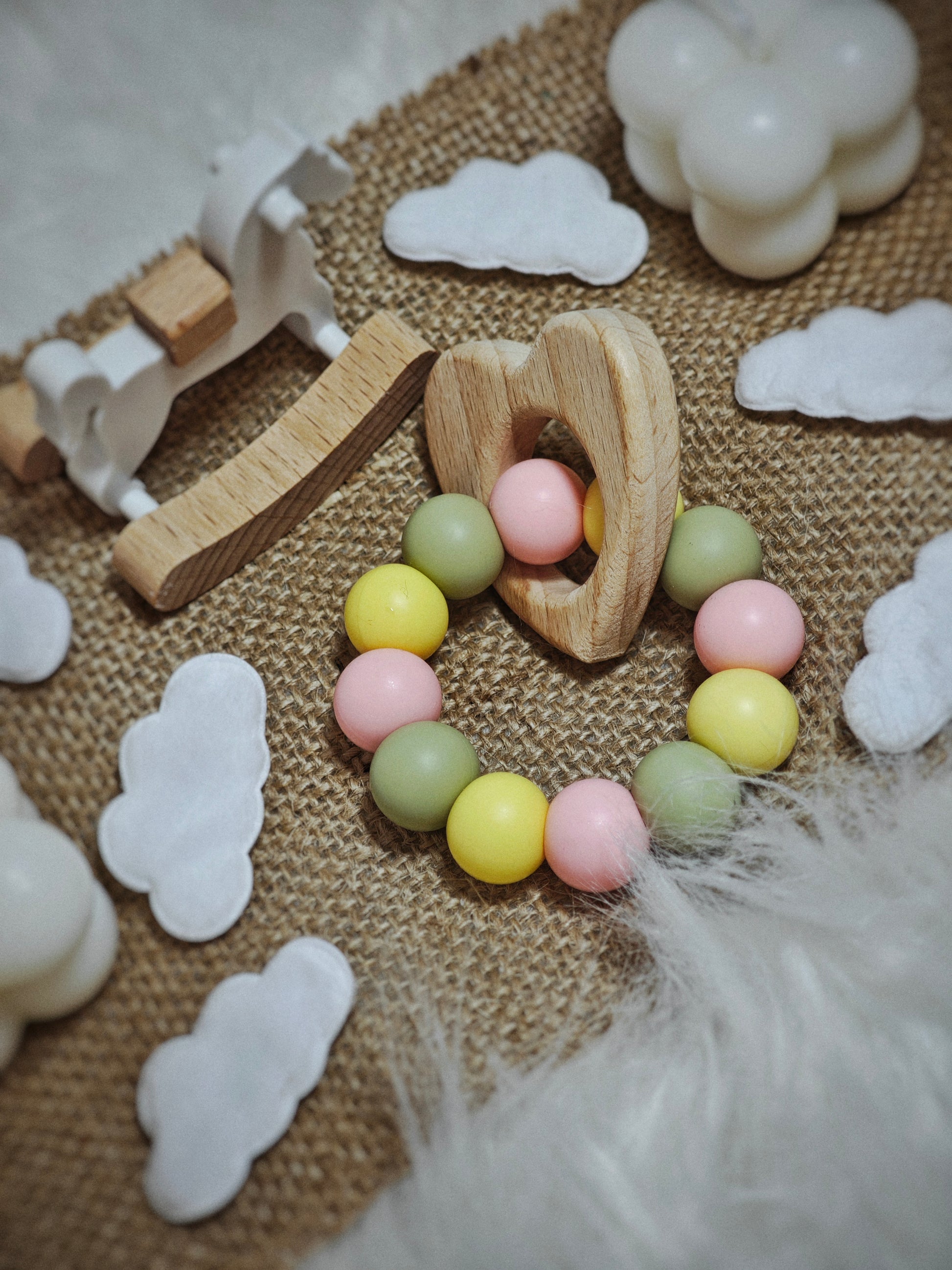 Širdelės formos medinis kramtukas su švelnių pastelinių spalvų karoliukais. Jis ramina dantenas, skatina motoriką ir suteikia jaukumo kiekviename mažylio žaidime. 🩷🌿