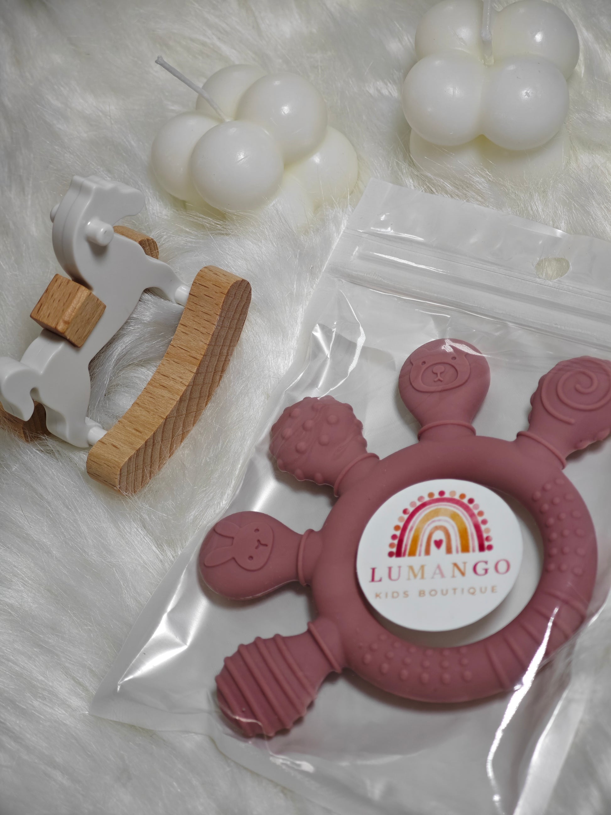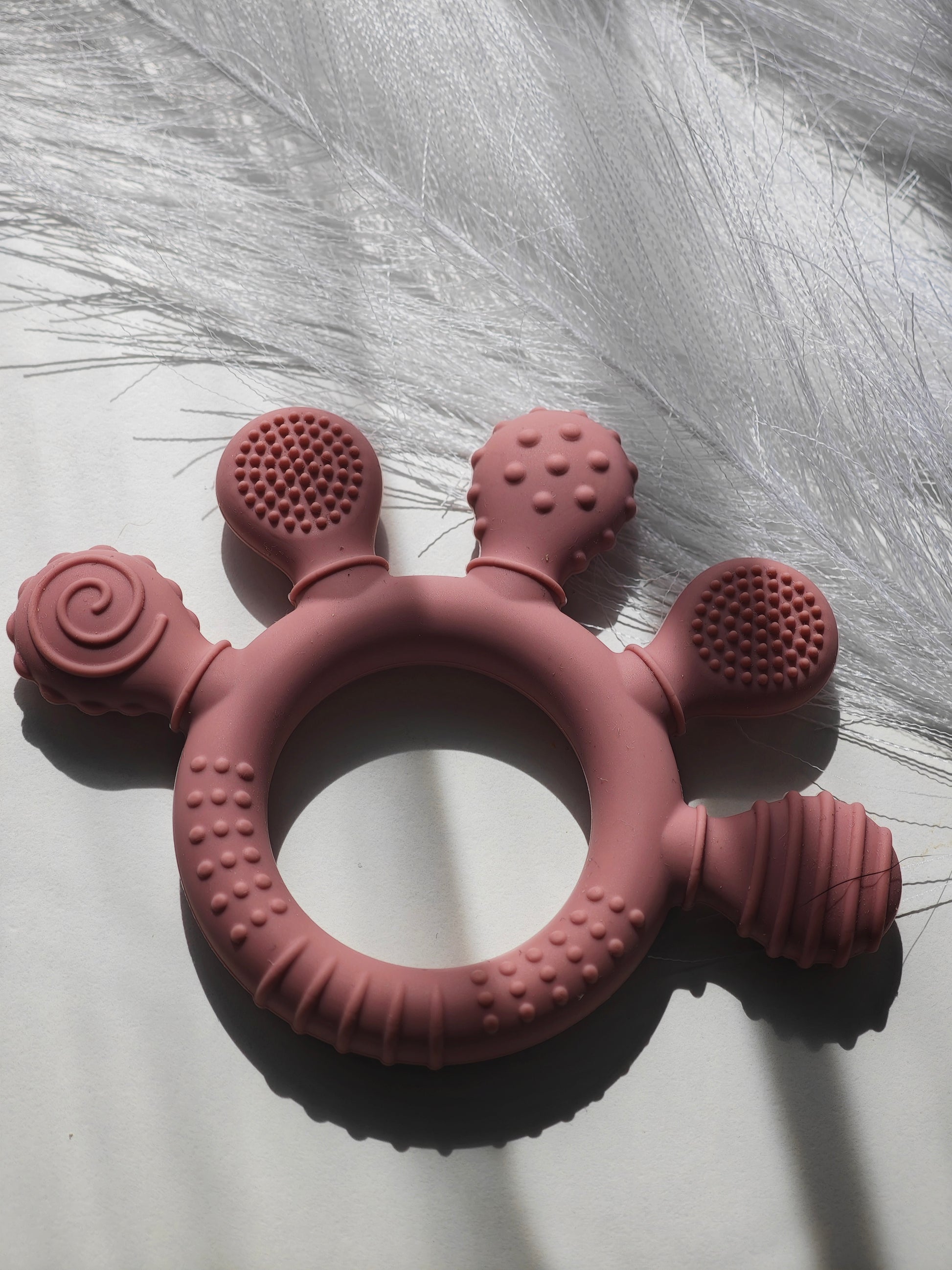 Minkštas, saugus ir patogus mažoms rankytėms. Pagamintas iš maistinio silikono, su skirtingų tekstūrų paviršiais – kad dantukų dygimas būtų lengvesnis ir smagesnis.