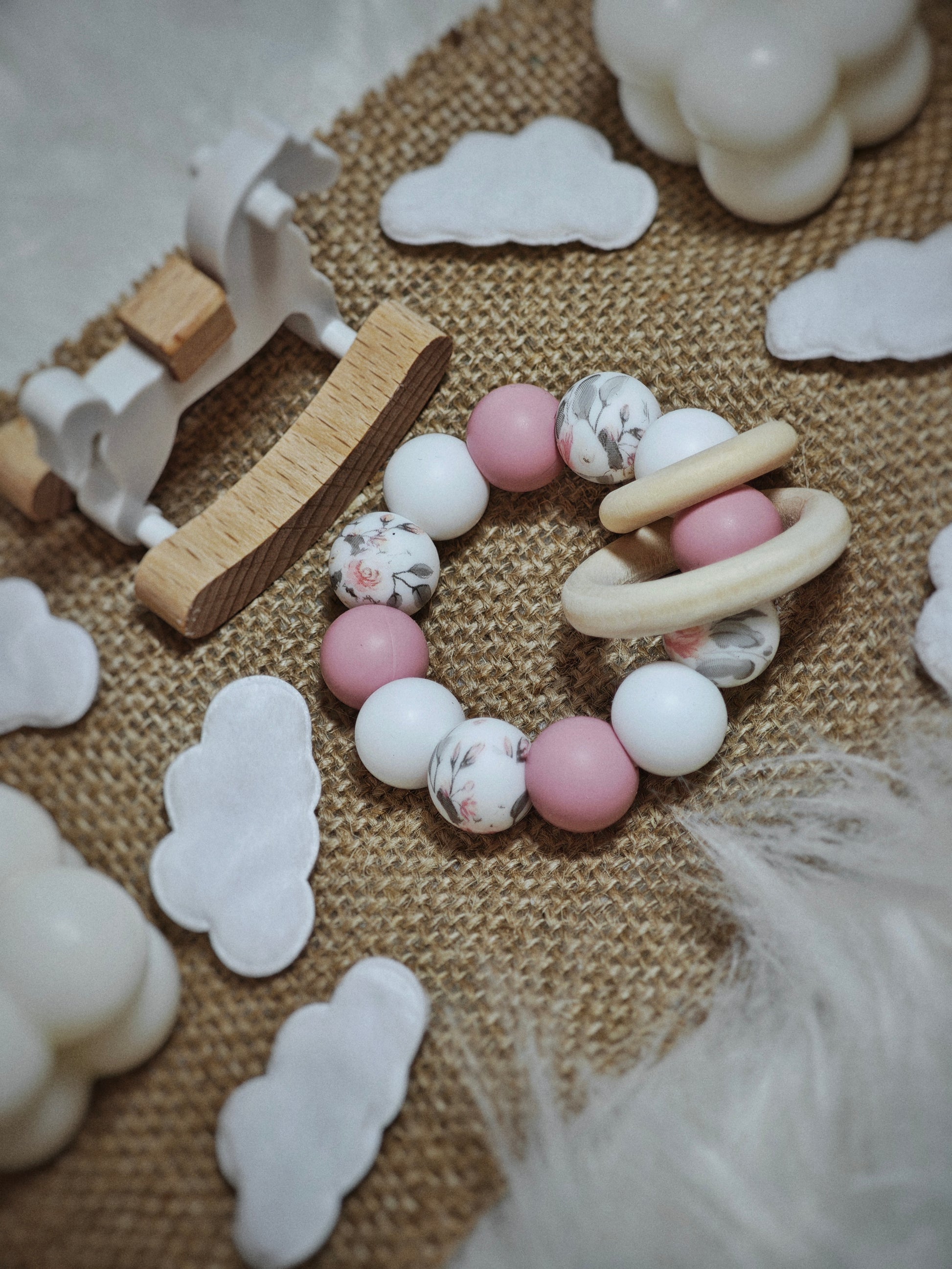 Švelnios rožinės, baltos ir gėlytėmis puoštos detalės sukuria jaukų bei mielą kramtuką. Mediniai žiedeliai skleidžia malonų barškesį, todėl mažylis džiaugsis ne tik spalvomis, bet ir garsais. 🩷🌸