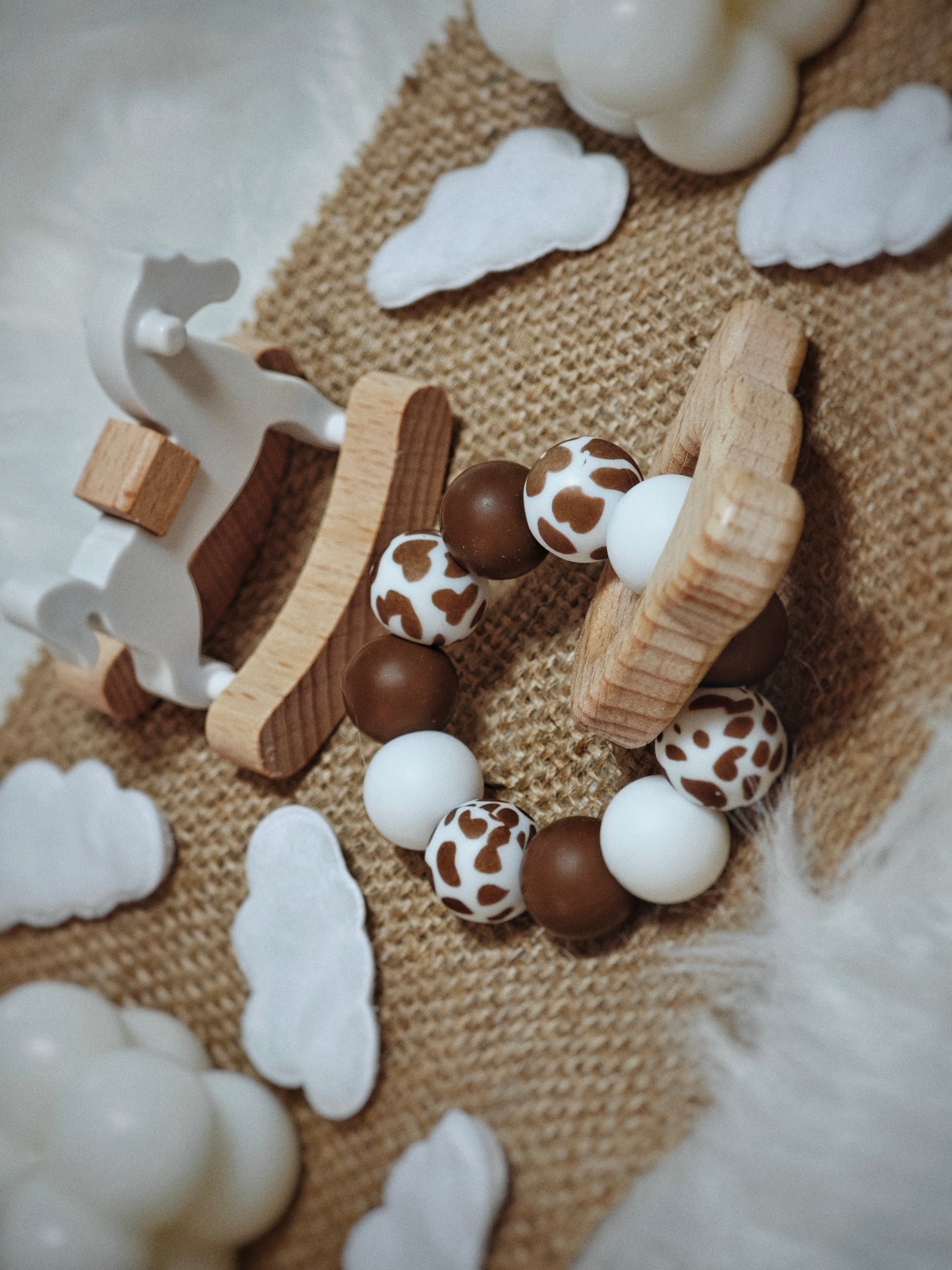 Natūralus kramtukas su meškučio formos mediniu žaisliuku. Derinys iš baltų, rudų ir gyvūnų raštų karoliukų suteikia šilumos. Tai puikus pasirinkimas tiems, kurie vertina jaukumą ir natūralumą. 🤎