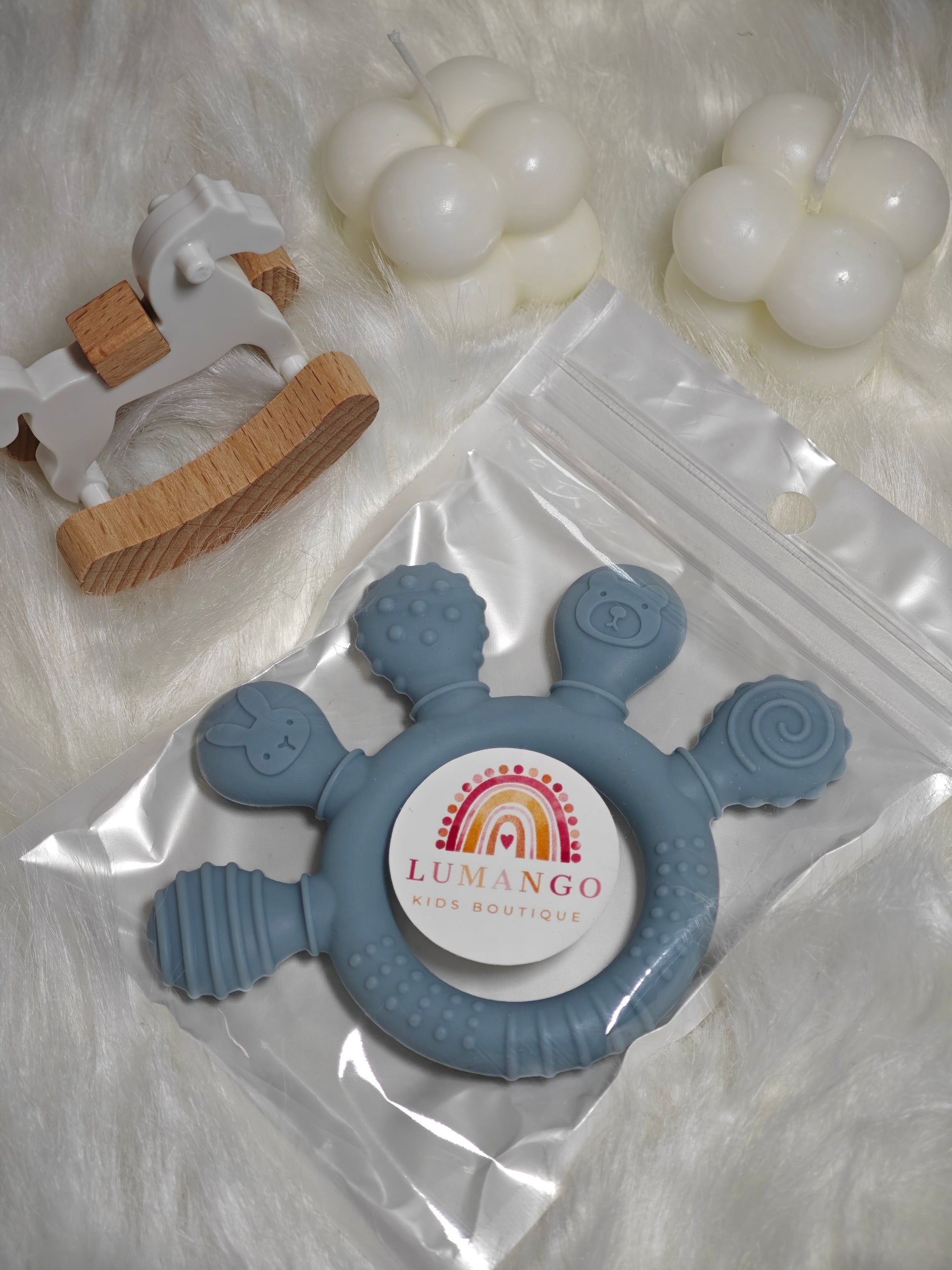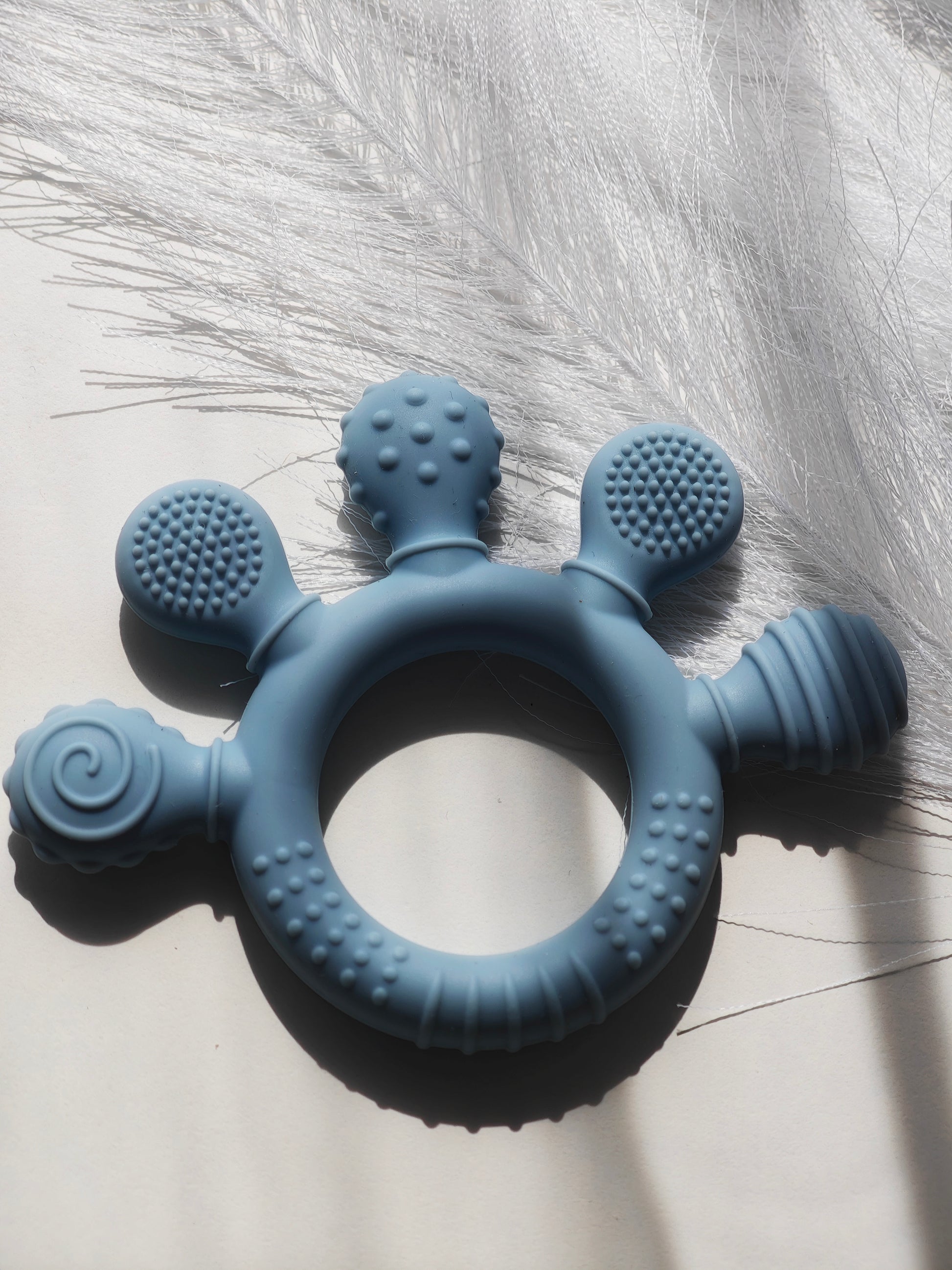 Minkštas, saugus ir patogus mažoms rankytėms 🩵Pagamintas iš maistinio silikono, su skirtingų tekstūrų paviršiais – kad dantukų dygimas būtų lengvesnis ir smagesnis.