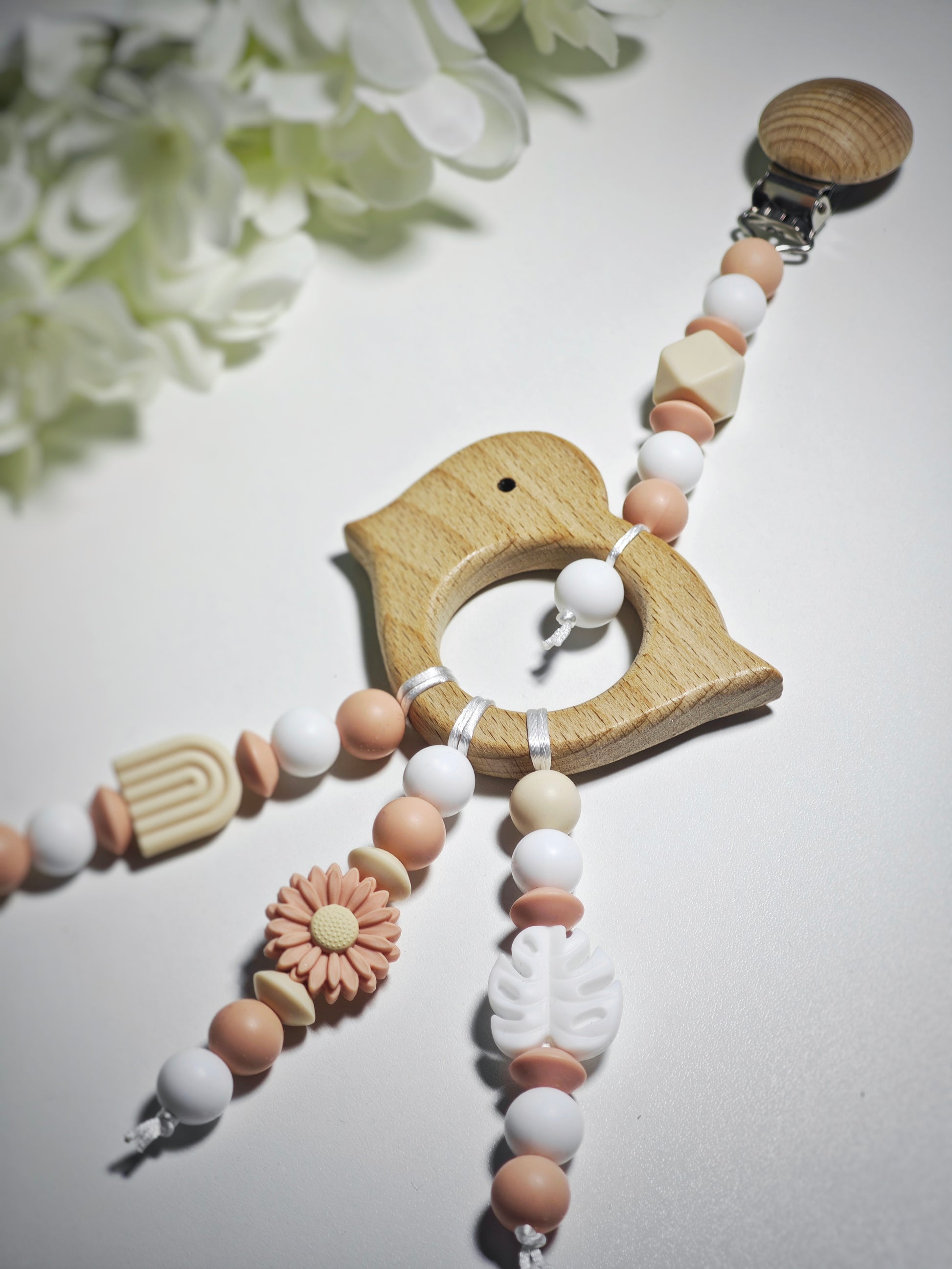 Rankų darbo pakabinamas žaisliukas ant vėžimėlio , automobilio kedutės lovytės ir t.t . Lavina kūdikio smalsumą, regą ir motoriką, ramina kelionės metu ir padeda išvengti nuobodulio. Kiekvienas žaislas pagamintas iš maistinio silikono bei natūralios medienos, todėl yra visiškai saugus kūdikiui.