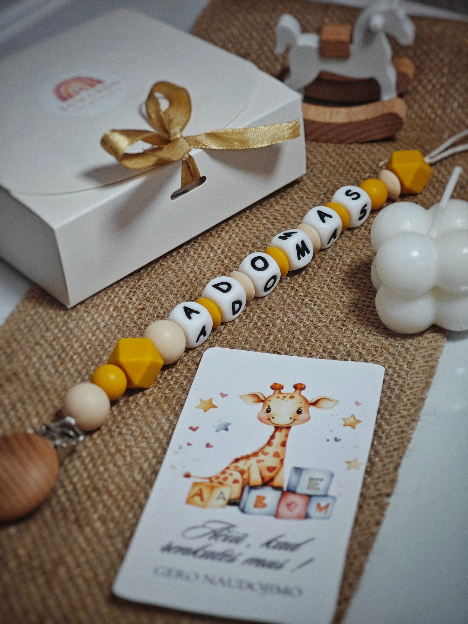Rankų darbo personalizuotas vardinis čiulptuko laikiklis
