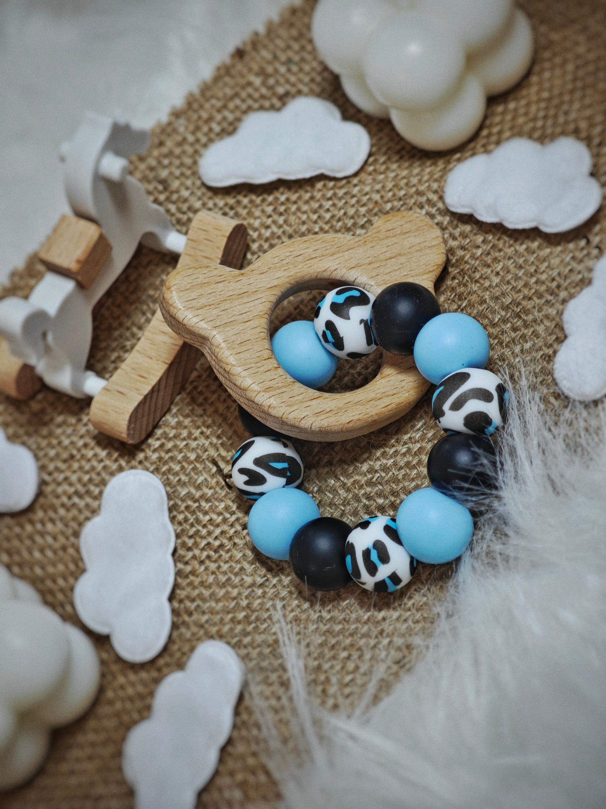 Rankų darbo silikoninis kramtukas - pagamintas iš saugių silikoninių mėlynos ir juodos spalvos karoliukų kurie puikiai gelbsti dantukų dygimo periode. Taipogi lavina kūdikio smulkiąją motoriką! Stilga patogu ir praktiška !