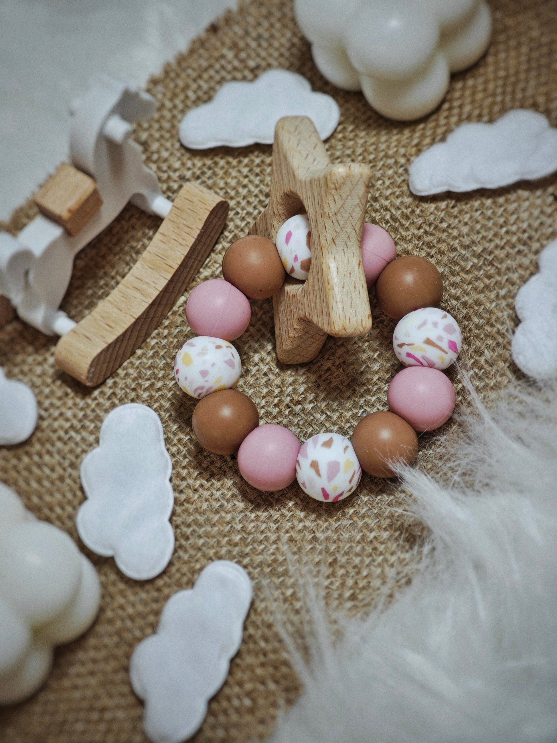 Šiltų rudų , rausvų ir baltų spalvų derinys puikiai derantis su medine žvaigždute. Švelnus dizainas kuris primena desertą. Puikus pagalbininkas dygstant dantukams taipogi lavinant smulkiąją motoriką.